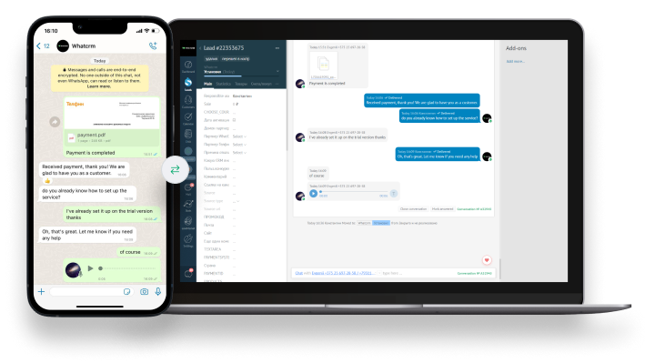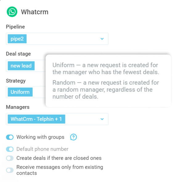 • Integration of Kommo and WhatsApp is carried out within 5-10 minutes. Users themselves connect and customize the Whatcrm service according to their tariff plan. Here you will find detailed instructions on how to connect Whatsapp to Kommo.
