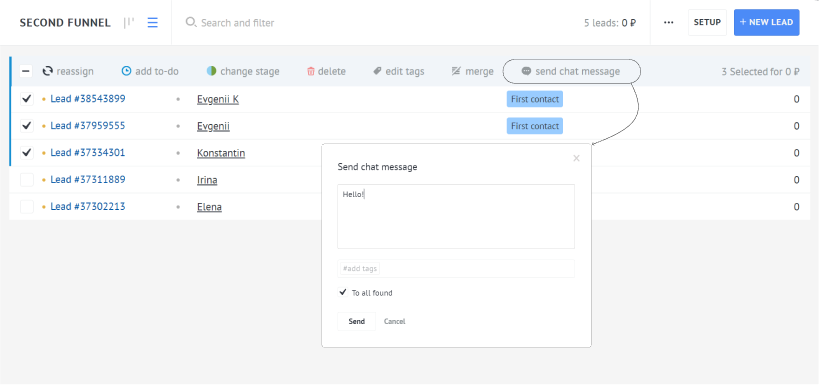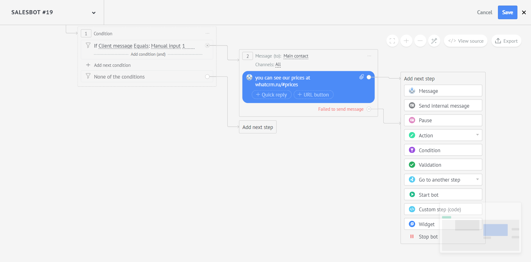 • Salesbot is a bot that can be programmed to perform certain actions. It helps to receive data from users via WhatsApp and other messengers. This feature is included in all Whatcrm tariffs.