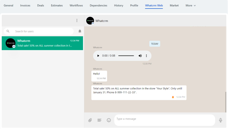 Integrated into leads, contacts and deals entities, allows you to save message history and share information.
